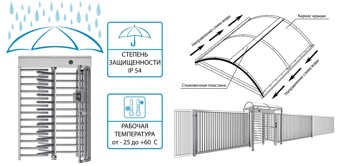 При использовании полноростового турникета РСТ 600 на открытом воздухе необходимо использовать защитный навес (приобретается отдельно). Такие меры предосторожности предохраняют турникет от прямого воздействия влаги и различных атмосферных осадков, обеспечивая долгосрочную стабильную работу устройства. Эксплуатация крыши допускается при температуре окружающего воздуха от -40°С до +60°С и влажности воздуха до 90%.