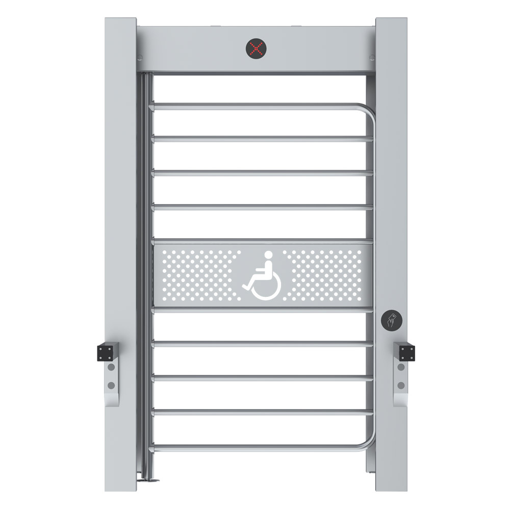 Полноростовый турникет с единой калиткой используется для контроля и ограничения доступа посетителей (в том числе с колясками, велосипедами, и людей с ограниченными возможностями) на объект. Обеспечивает поочередно вход и выход. Основная секция предусматривает только проезд инвалидов, людей с колясками и велосипедистов. Устанавливается как самостоятельным блоком, так и составе модульного заграждения из нескольких турникетов.