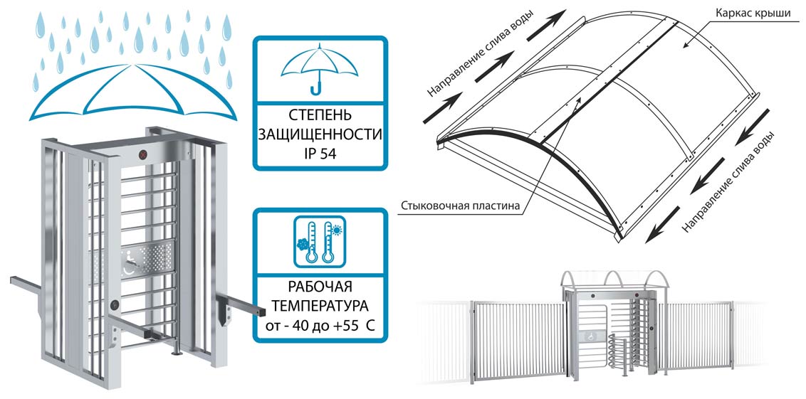При использовании полноростового турникета СПЕКТР на открытом воздухе необходимо использовать защитный навес. Такие меры предосторожности предохраняют турникет от прямого воздействия влаги и различных атмосферных осадков, обеспечивая долгосрочную стабильную работу устройства. Эксплуатация крыши допускается при температуре окружающего воздуха от -40°С до +55°С и влажности воздуха до 90%.