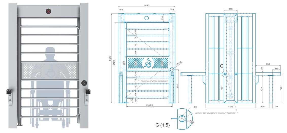 • Надежная безопасная конструкция — сварная рама из нержавеющей стали, защита от пыли/влаги IP 54. Установка в помещениях и на улице (требуется навес). Отсутствуют травмоопасные элементы для маломобильных групп населения. Световой сигнализатор направления прохода.
