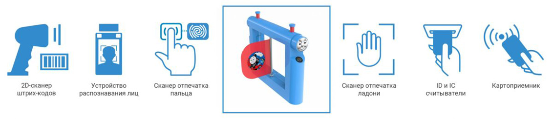 Детский турникет может быть оснащен считывателем штрих-кода, картоприемником, устройством контроля времени, устройством распознавания лица, идентификаторами личности по отпечатку пальца или ладони. Возможна интеграция стороннего оборудования через сухие контакты – компьютер или металлодетектор – для одновременного контроля над пропускной системой всего оборудования с более надежным контролем доступа.