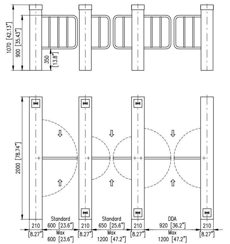 2-канальные петли индуктивности (одна секция на вход / одна на выход) достаточно чувствительны, чтобы обнаружить даже такие малые металлические детали, как велосипеды, мопеды и другие. Форма специально разработанной индуктивной петли способна предотвратить любое влияние на работу турникета окружающих его металлических поверхностей.