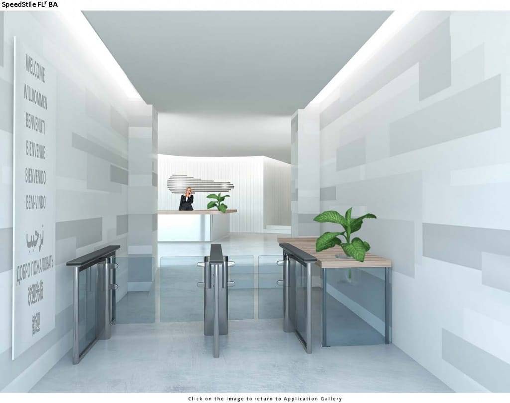 Турникеты с распашными створками SpeedStile FLS отличаются корпусом шириной 12 см с центральной секцией из 10 мм закаленного стекла.