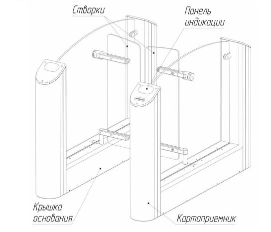 Корпус турникета выполнены из шлифованной нержавеющей стали, преграждающие створки – из закаленного стекла. Конструкция турникета имеет в своем составе интегрированный картоприемник. В нижней части модуля предусмотрена крышка основания для доступа к отверстиям для ввода кабелей БП, ПУ и СКУД.