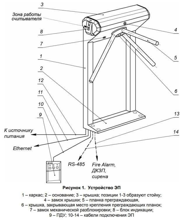 Электронная проходная состоит из стойки (1-3) со встроенными в нее контроллером электронной проходной и двумя считывателями бесконтактных карт доступа с блоками индикации (8), трех преграждающих планок (5) и пульта дистанционного управления (9).