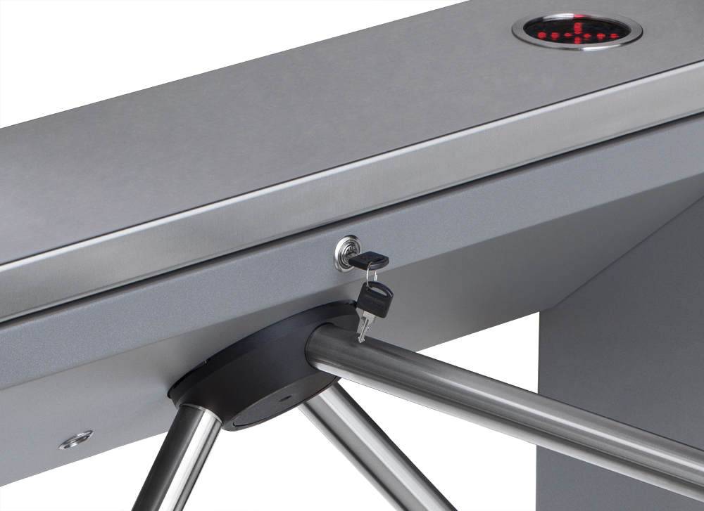 • В турникет встроен замок механической разблокировки, позволяющий в случае необходимости с помощью ключа разблокировать его (обеспечить свободный поворот преграждающих планок).