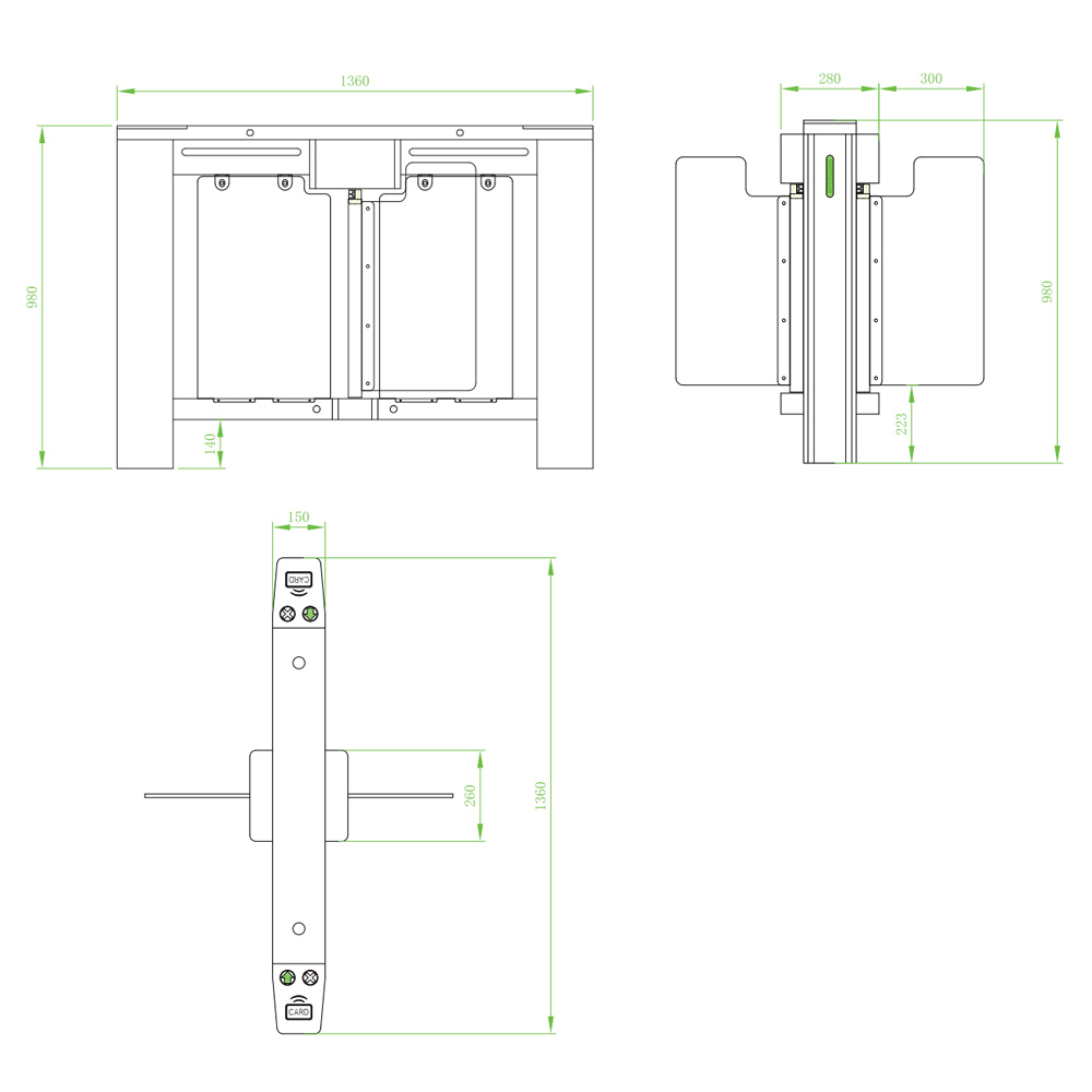 • Корпус (толщина 1.0 мм) и крышка турникета (толщина 1.2 мм) изготовлены из стали SUS304, створки из акрила