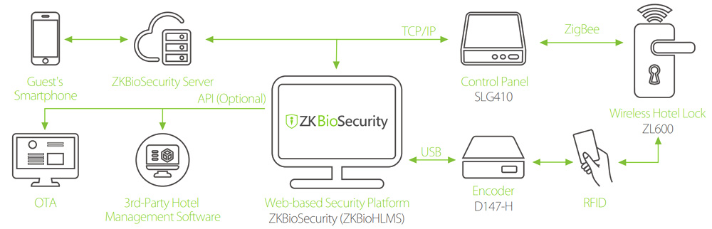 Кроме того, ZL600 работает со связью ZigBee, и пользователи могут управлять этим интеллектуальным дверным замком отеля локально и удаленно.