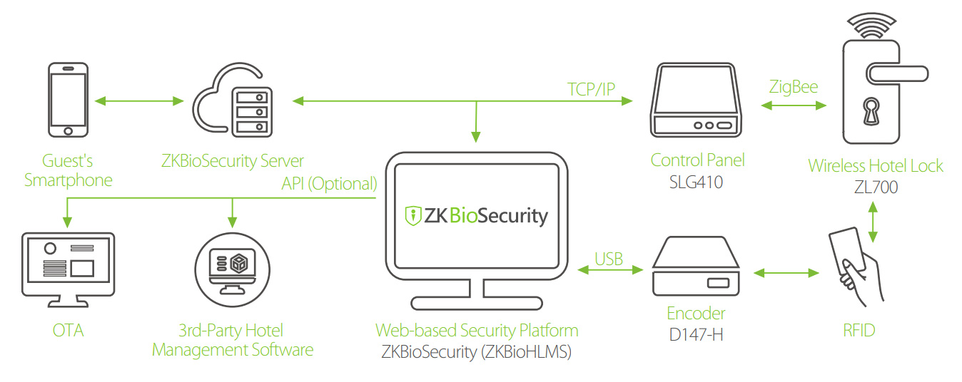 ZL700 совместим с системой управления гостиничными замками ZKBioSecurity (ZKBioHLMS), замок поддерживает дистанционное управление, мониторинг состояния и синхронизацию записей разблокировки.